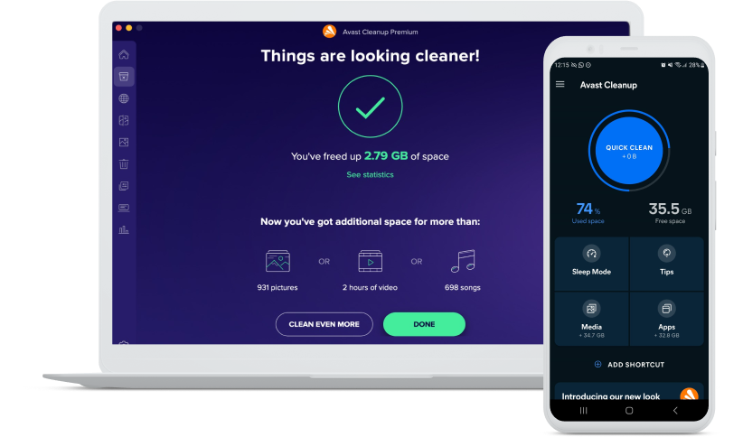 Don’t settle for a mediocre computer experience — raise your performance to new heights with Avast Cleanup. Remove clutter, review and fix problems, and supercharge your machine with our incredibly powerful and easy-to-use automated cleaning suite.