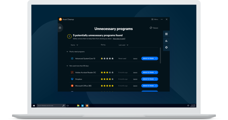 Testen Sie Avast Cleanup Premium kostenlos – keine Kreditkarte erforderlich. Bereinigen Sie Ihr Gerät und optimieren Sie seine Leistung mit unserem PC-Bereiniger, der Ihnen dabei hilft, Gigabytes an Speicherplatz zurückzugewinnen und dafür zu sorgen, dass Ihr Computer wieder optimal läuft.