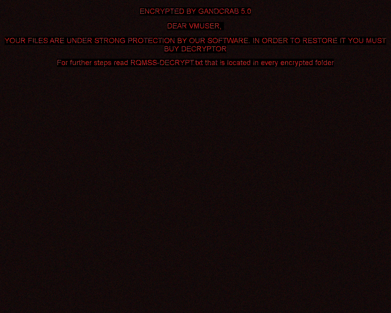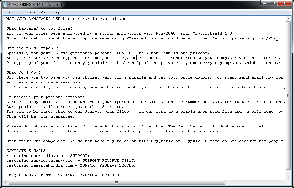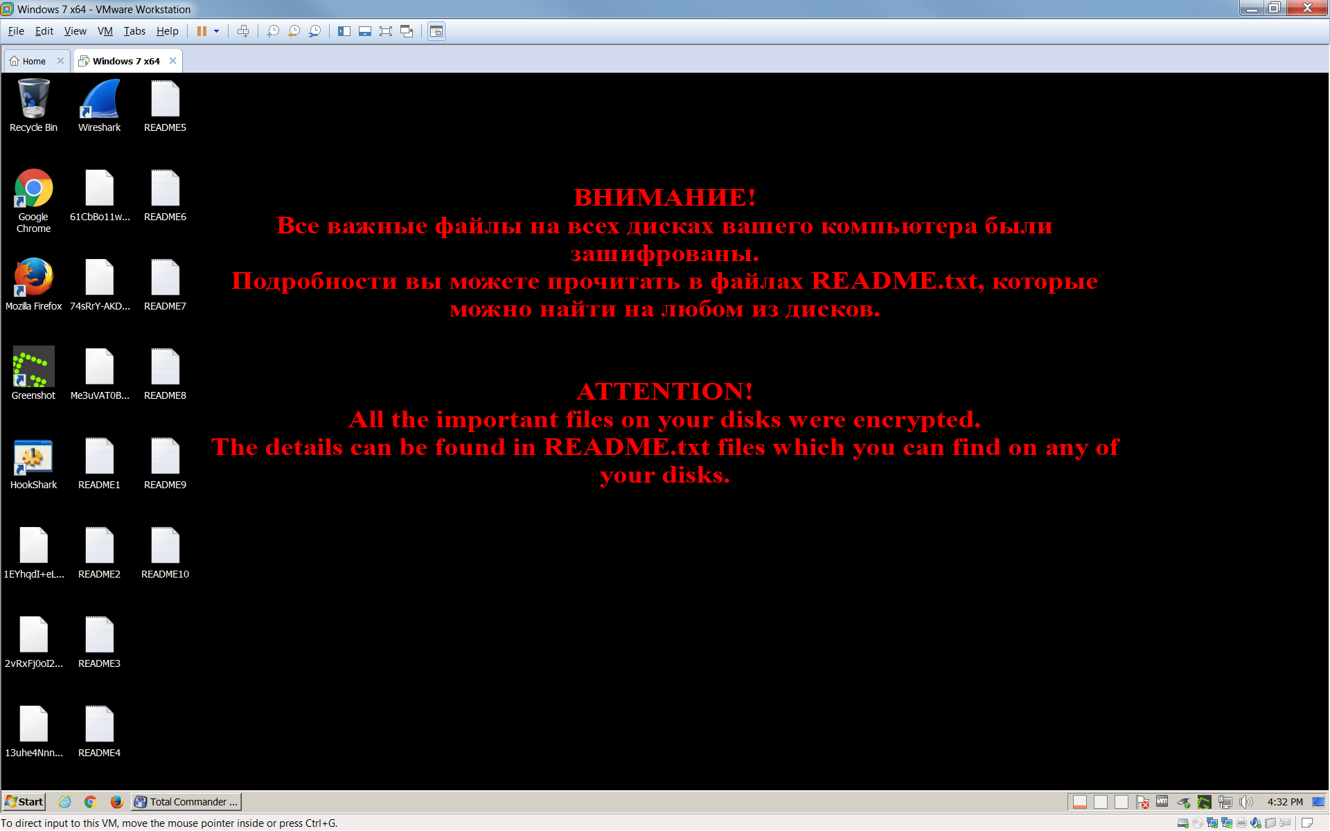 Etter at filene har blitt kryptert, opprettes flere filer på brukerens skrivebord med navnet READMEn.txt, der n er et tall fra 1 til 10. De opprettes på flere språk og inneholder denne teksten: