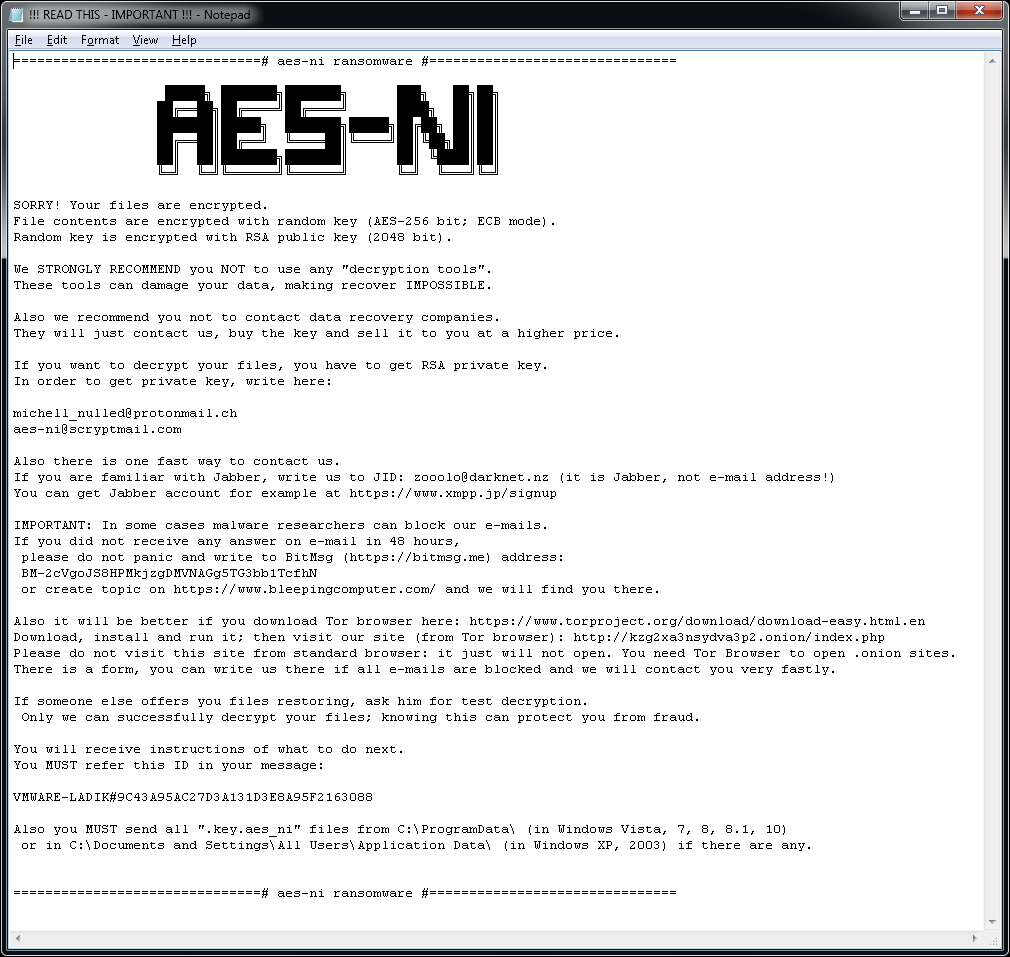 AES_NI er en type løsepengevirus som først dukket opp i desember 2016. Siden den gang har vi observert mange varianter med ulike filtyper. Når dette løsepengeviruset krypterer filer, brukes AES-256 kombinert med RSA-2048.